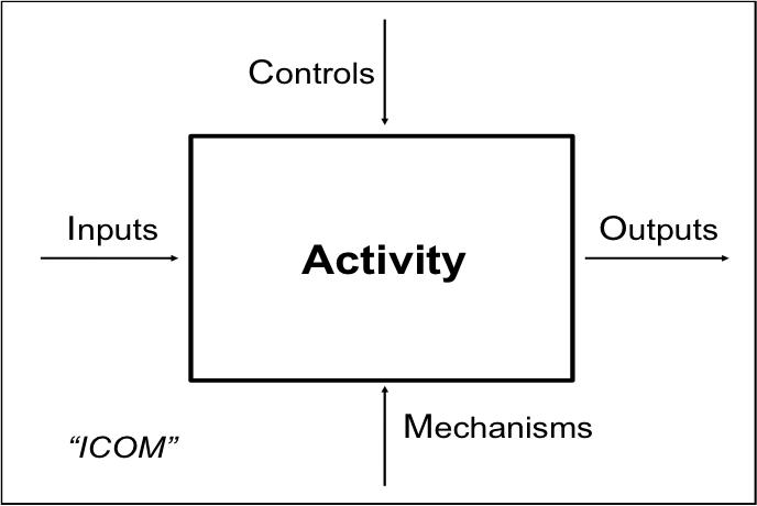 IDEF-0 uses Inputs, Outputs, Controls and Mechanisms (ICOM) to show the parts of an activity within an enterprise.: