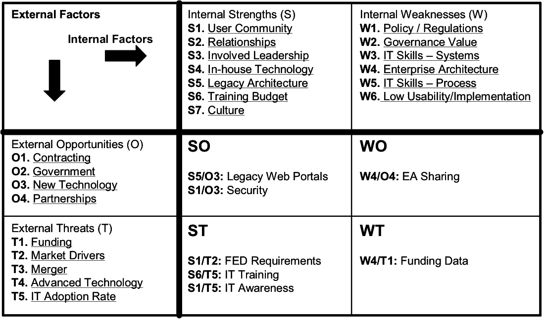 From the identification of Internal Strengths (S), Internal Weaknesses (W), External Opportunities (O), and External Threats (T) for the enterprise, a matrix arrangement like the example above can help to reveal internal and external areas to focus on. This SWOT Analysis is also used to help enterprise architects and strategic planners to develop Concept of Operations (CONOPS) scenarios that detail current and future operating environments.